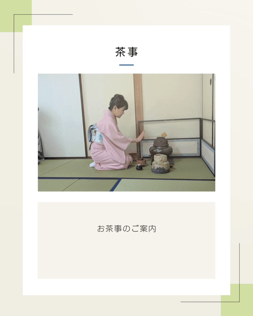 茶事は単なるお茶会ではなく、お茶・食事・もてなしの作法を通じて、茶道の精神を深く味わう場です。